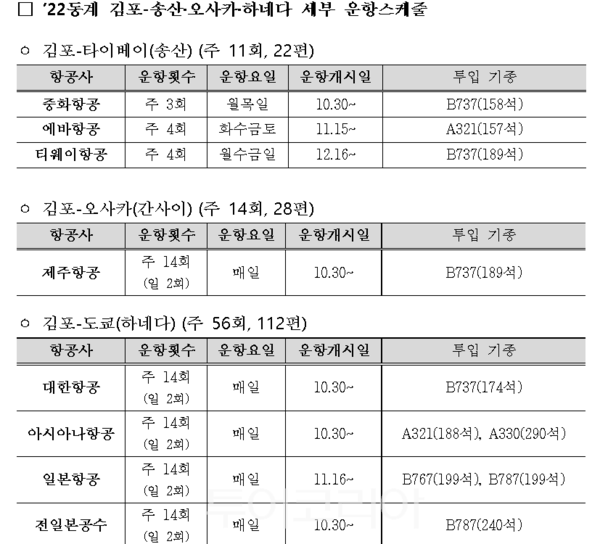 김포~오사카는 매일 4편(2회) 주 28편, 김포~타이베이는 주 6편(주3회/일, 월, 목) 운항하며, 11월과 12월에는 에바항공과 티웨이항공이 각각 주 8편(4회) 타이베이 노선을 추가로 운항할 예정이다.