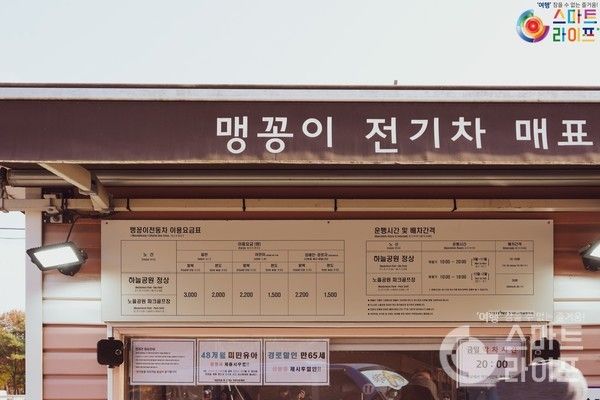 주차장에서 하늘공원 맹꽁이 열차 매표소까진 화살표가 있어서 쉽게 찾아갈 수 있다. 특히나 노을이 진 뒤는 지대가 높아 급격히 추워지므로 내려올 때도 탑승하는 것이 좋다. 이용시간 : 3-11월 10:00 ~ 20:00, 12-2월 10:00 ~ 18:00. 이용요금 일반 왕복 3000원, 편도 2000원, 어린이/경로 왕복 2200원, 편도 1000원