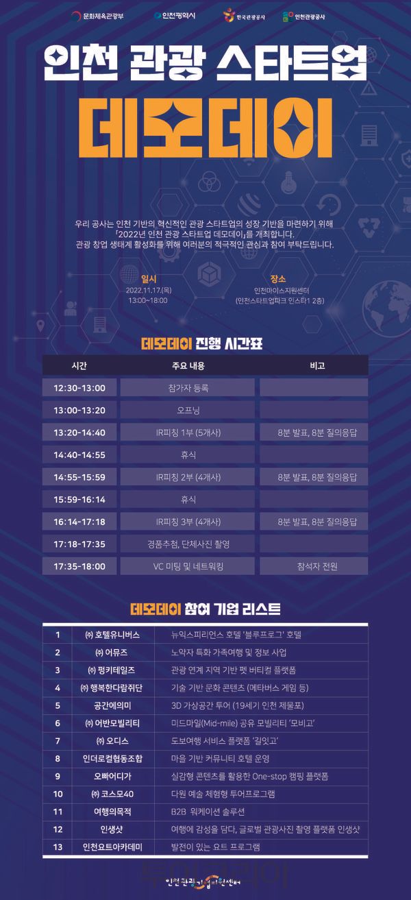 참가 기업은 △뉴익스피리언스 호텔 ‘블루프로그’호텔 (주)호텔유니버스, △노약자 특화 가족여행 및 정보 사업을 지원하는 (주)어뮤즈, △관광 연계 지역 기반 펫 버티컬 플랫폼을 제공하는 (주)펑키테일즈, △기술 기반 문화 콘텐츠(메타버스, 게임 등)를 제공하는 (주)행복한다람쥐단, △3D 가상공간 투어(19세기 인천 제물포)를 제공하는 '공간에의미', △미드마일 공유 모빌리티 '모비고(Mid-mile)' △어반모빌리티, 도보여행 서비스 플랫폼 ‘길잇고’ △(주)오디스, 마을 기반 커뮤니티 호텔 운영 '인더로컬협동조합', △실감형 콘텐츠를 활용한 One-stop 캠핑 플랫폼 '오빠어디가', △다원 예술 체험형 투어프로그램을 제공하는 '(주)코스모40', △B2B 워케이션 솔루션 '여행의목적', △여행을 감성을 담다, 글로벌 관광사진 촬영 플랫폼 '인생샷', △발전이 있는 요트 프로그램 '인천요트아카데미' 등이다.