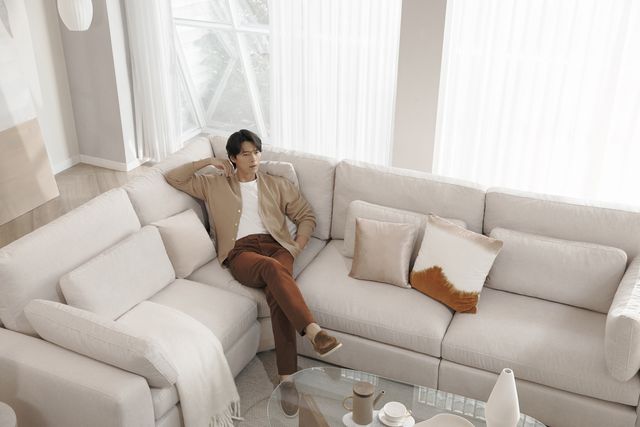 현빈이 앉아서 휴식을 취하고 있는 소파는 자코모 “헴프 코너형 젠위브 패브릭 소파” (사진제공 : 소파 전문 브랜드 “자코모(JAKOMO)”)