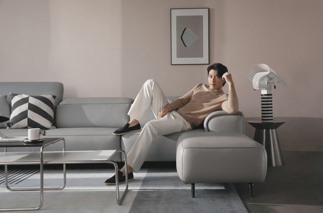 자코모의 새 모델 현빈과 함께 선보이는 또 다른 제품 ‘뉴클레버 소파”는 비텔로 슈렁큰 천연면피 통가죽으로 제작되었다.