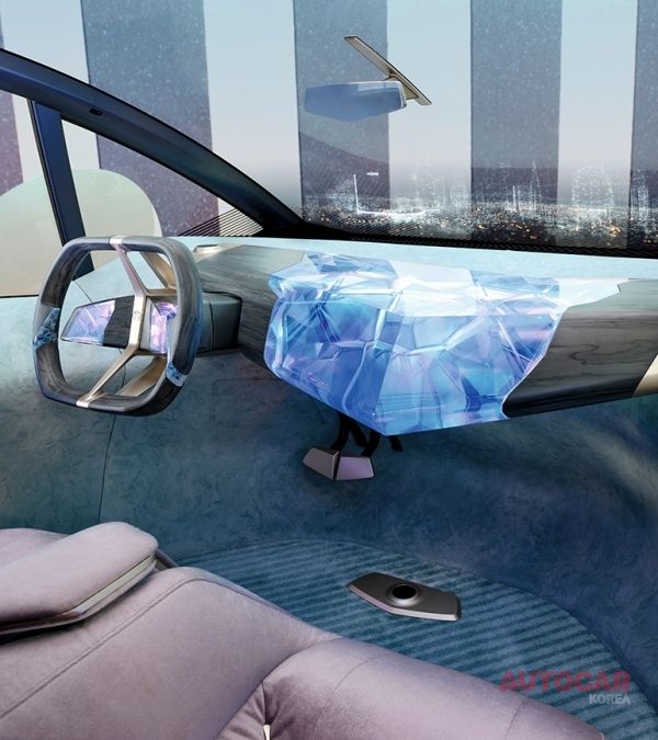 스티어링 휠은 바이오 원목 분말을 사용해 3D 프린팅으로 제작했다. “우리는 단지 나무를 사용하는 것이 멋질 것이라고 생각해서 이렇게 만든 것은 아니다”라고 BMW 디자인 책임자 도마고 두케는 말한다. “오늘날의 스티어링 휠은 금속 뼈대를 폼으로 덮은 다음 다시 플라스틱이나 가죽으로 감싼 구조로 되어 있는데, 이것을 분해하는 것은 불가능하다. 때문에 원래의 재료와 같은 품질이 아닌 2차 재료를 만들게 된다. 우리는 과거에 나무로 만든 스티어링 휠이 있었다는 것을 상기했다. 당시에는 한 덩어리로 만들어져 폐기물이 많았다. 하지만 3D 프린팅을 사용하면 폐기물 없이 목재 분말로 제작할 수 있다.”