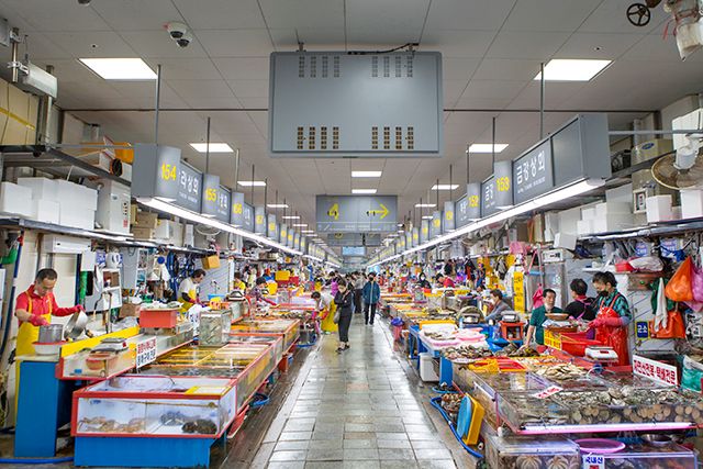 수산 시장만큼 흥미로운 구경거리도 없다. 다닥다닥 붙은 노점을 따라가면 다채로운 어종이 끊임없이 이어진다. 실내에 마련된 현대식 시장도 마찬가지다. 빼곡히 들어선 수조마다 활어와 조개류, 대게, 킹크랩 등이 수북하다. 횟감을 사면 2층 회식당에서 맛볼 수 있다.