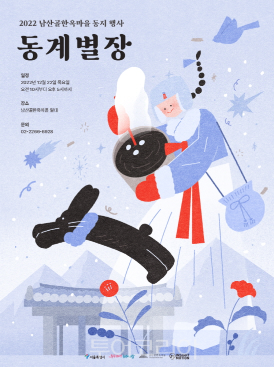 남산골한옥마을에서 동지 당일인 22일 추운 겨울 따스하게 쉬어갈 수 있는 '동계별장'을 주제로 '세시울림 동지-동계별장'이 진행돼, 액운 쫓고 놀이 하며 일년 중 가장 긴 밤을 보냈던 옛 선조들의 ‘동지나기’ 전통을 직접 체험해 볼 수 있다.