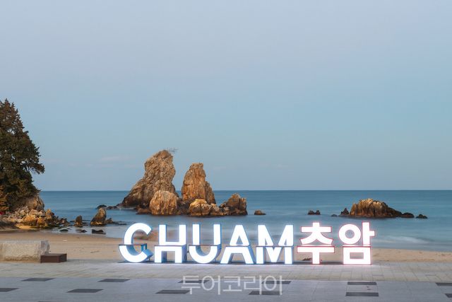 추암(CHUAM. ㅊ ㅜ ㅇ ㅏ ㅁ )글자를 이용해 설치한 조형물은 낮에는 의자로서, 야간에는 빛으로 추암을 알리는 랜드마크 포토존이 탈바꿈한다.