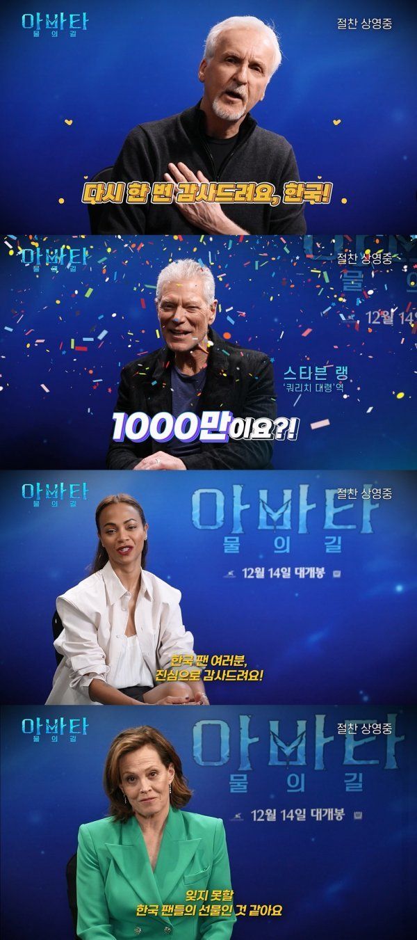 전편에 이어 시리즈 쌍천만을 기록한 소식에 제임스 카메론 감독, 존 랜도 프로듀서, 샘 워싱턴, 조 샐다나, 시고니 위버, 스티븐 랭 등 '아바타: 물의 길'의 주역들이 한국 팬들에게 직접 감사 인사를 보내왔다. 샘 워싱턴과 스티븐 랭의 감탄으로 시작한 영상은 “한국 팬 여러분, 진심으로 감사드린다”며 마음을 전하는 조 샐다나의 모습으로 이어졌다.
