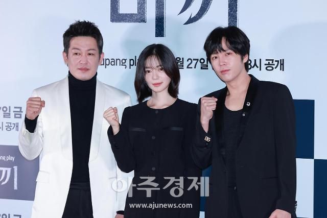 배우 허성태, 이엘리야, 장근석이 25일 오후 서울 강남구 메가박스 코엑스점에서 열린 쿠팡플레이 시리즈 '미끼' 언론시사회에 참석해 포즈를 취하고 있다.[사진=유대길 기자 dbeorlf123@ajunews.com]