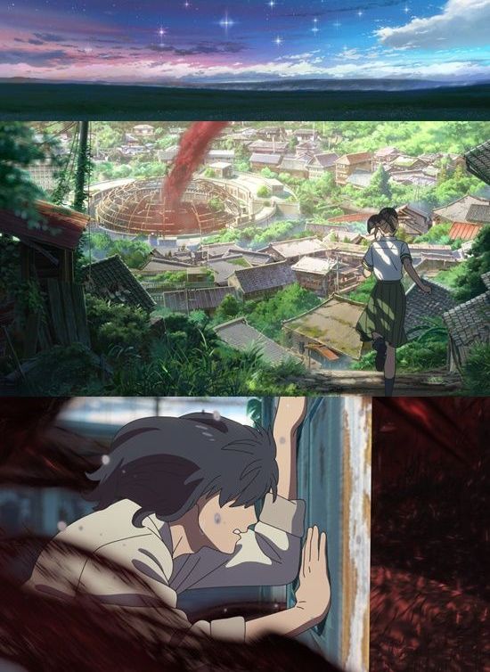 이어진 스틸에서 스즈메는 버려진 마을 한 가운데 놓인 재난의 문을 열게 되는데, 이후 문에서 뿜어져 나오는 재난이 마을을 덮치며 위기를 암시하고, 이를 필사적으로 막는 소타의 모습이 그려져 긴장감을 조성한다.