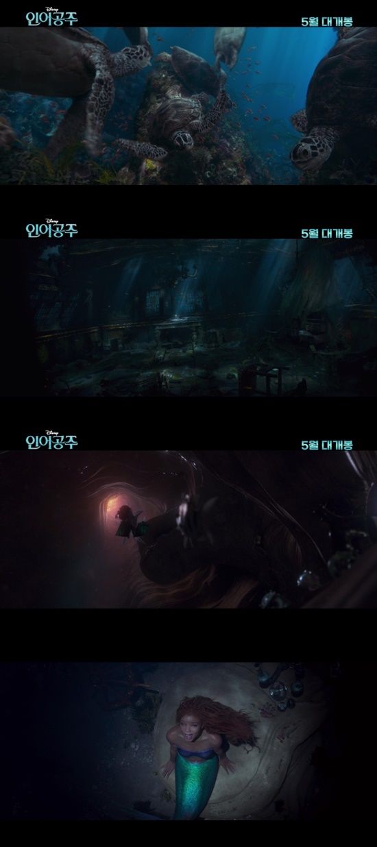 특히 거대한 파도와 신비로운 분위기를 자아내는 물속 풍경부터 물고기, 거북이 등 다양한 해양 생물들의 모습까지 차례로 비치는 가운데, 바닷속을 자유롭게 헤엄치는 에리얼이 등장해 눈길을 끈다.