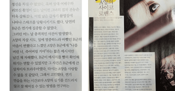 '우먼센스'에 실린 글에 등장한 A양과 B군의 정체는 드러나지 않았지만, 정황상 김정현과 서예지를 가리키는 것 같다는 의견이 많았습니다.