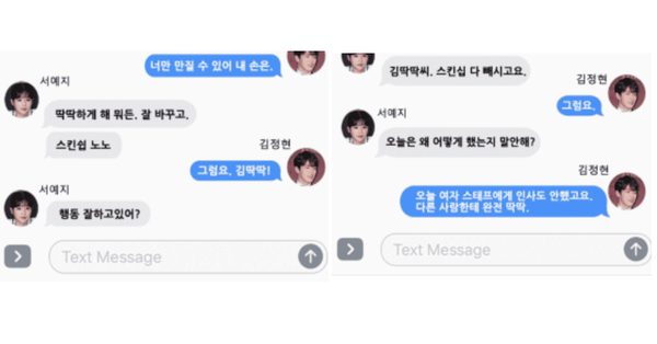 디스패치가 공개한 김정현과 서예지와의 대화 내용에서는 서예지가 김정현에게 여배우와의 애정신과 스킨십은 모두 빼고 수정하라고 반복해서 지시하고 있음을 확인할 수 있습니다.