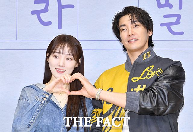 배우 이성경과 김영광(오른쪽)이 21일 오전 서울 종로구 JW 메리어트 동대문 스퀘어 서울에서 열린 디즈니 플러스 드라마 '사랑이라 말해요' 제작발표회에 참석해 포즈를 취하고 있다. /박헌우 기자