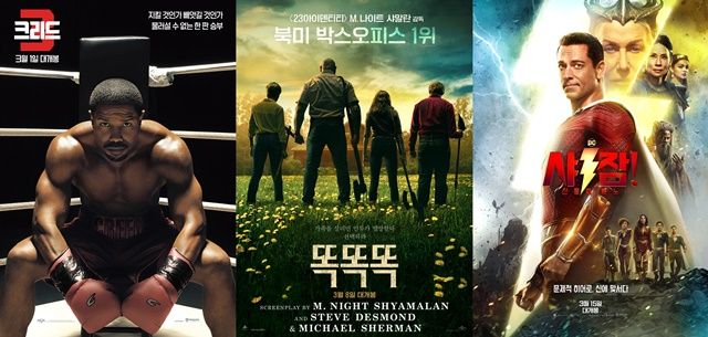 영화 '록키'의 스핀오프 '크리드 3'가 3월 1일, 스릴러 장르의 영화 '똑똑똑'이 8일, DC 코믹스의 액션 블록버스터 '샤잠! 신들의 분노'(왼쪽부터)가 오는 15일 각각 스크린에 걸릴 예정이다. /각 작품 포스터