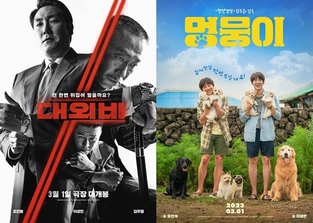조진웅 이성민 김무열 주연의 영화 '대외비'(왼쪽), 차태현 유연석 주연의 영화 '멍뭉이'가 3월 1일 개봉해 관객들을 만날 예정이다. /각 작품 포스터