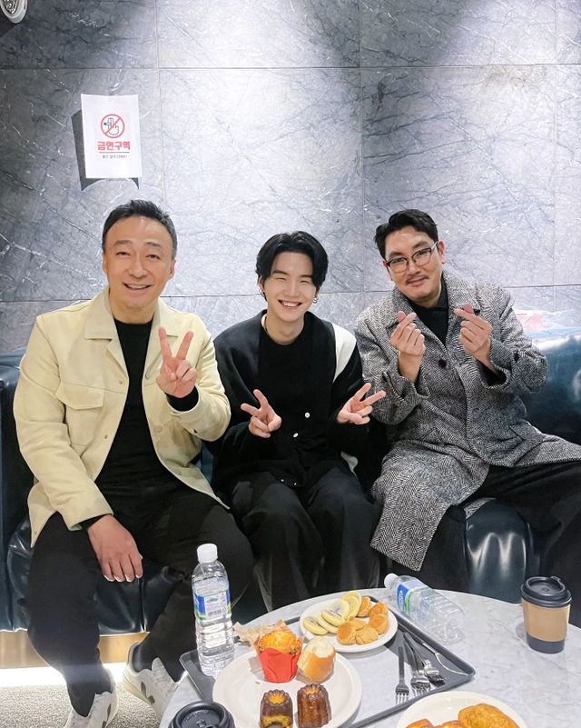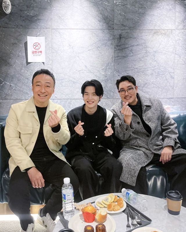 공개된 사진 속 슈가는 소파에 앉아 '대외비'의 주연 이성민, 조진웅과 함께 인증샷을 찍고 있다.