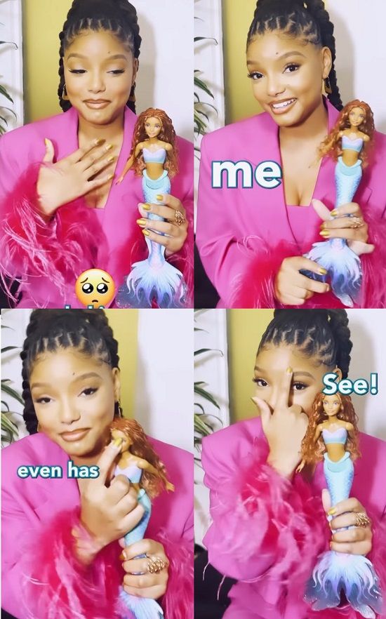 영상 속에서도 할리 베일리는 "정말 제가 흥분 되는 일이 있었어요. 눈물이 날 것 같아요. 짠. 이 친구는 '리틀 머메이드' 인어공주 인형입니다. 제겐 정말 큰 의미에요"라며 인형을 소개했다.