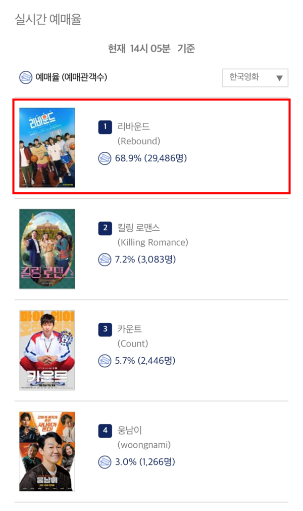 3일 영화관입장권 통합전산망 실시간 예매율에 따르면 '리바운드'는 16.1% 로 한국 영화와 4월 개봉작 중 예매율 1위를 달성했다. 한국 영화 중에서는 무려 68.9%의 압도적인 예매율이다.