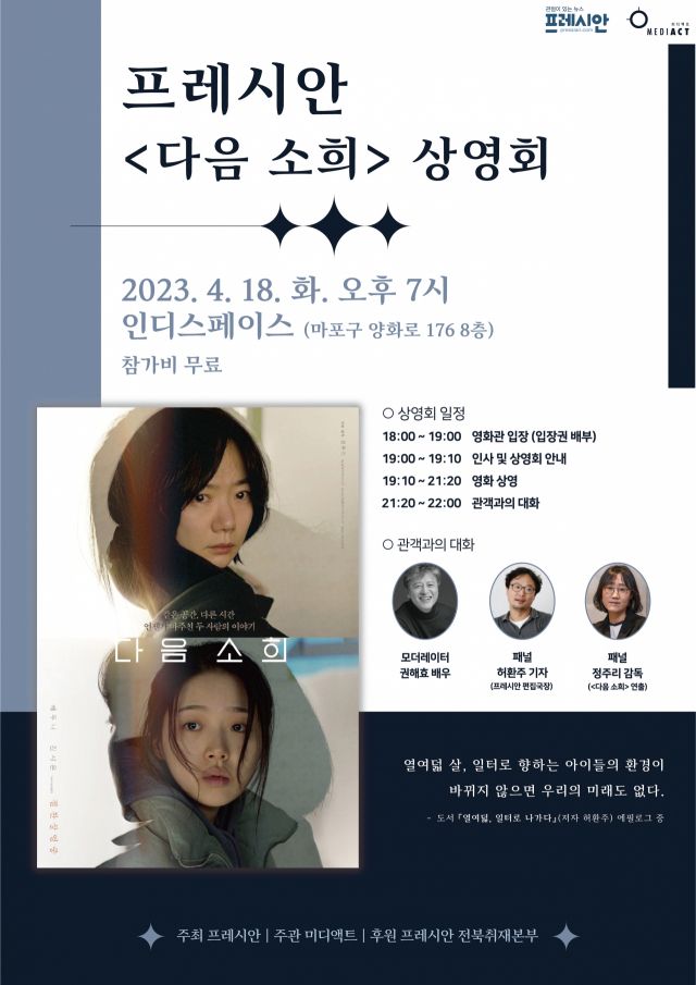<프레시안>이 오는 4월 18일 홍대 '인디스페이스'에서 <다음 소희> 상영회를 개최합니다.