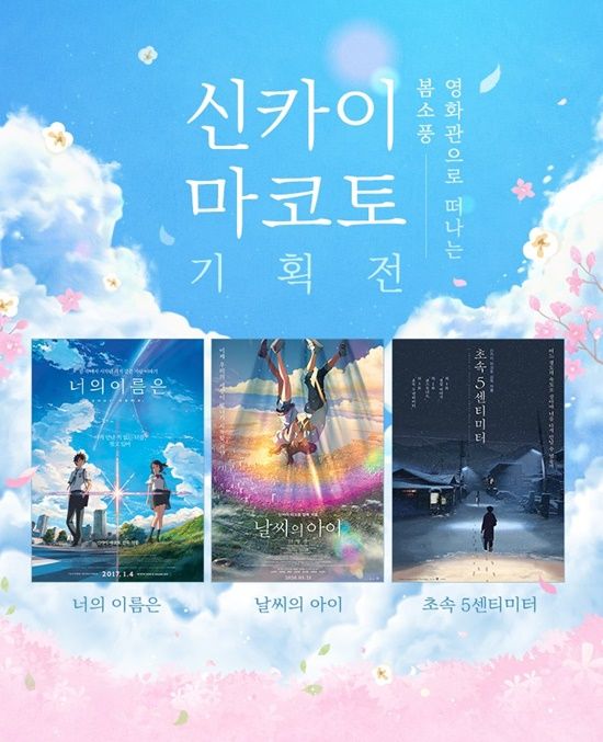 롯데시네마 월드타워, 노원, 광복을 비롯한 총 31개 극장에서 총 3편이 상영되며, 상영작으로는 국내에서 382만 관객을 동원, 극찬을 받으며 신드롬을 불러일으켰던 '너의 이름은.'을 비롯해 도시에 온 가출 소년과 하늘을 맑게 하는 소녀의 운명 같은 이야기를 담은 '날씨의 아이', 첫사랑의 아련함을 그린 벚꽃 이야기의 '초속 5센티미터'이며 특별 기획전 관람료는 1만원이다.