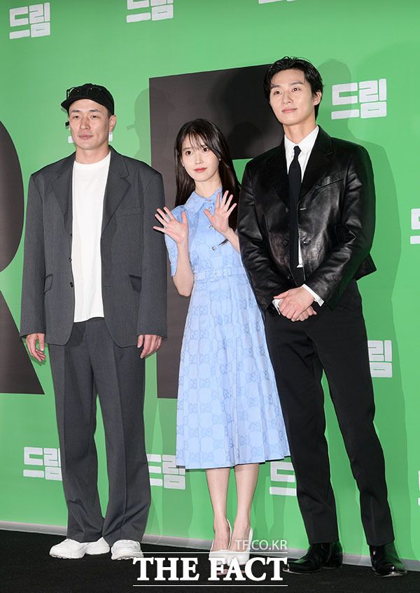 드림의 메가폰을 잡은 이병헌 감독(왼쪽)과 주연을 맡은 가수 겸 배우 아이유, 박서준의 모습.