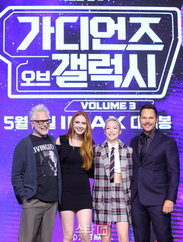 18일 오전 서울 영등포구 콘래드 서울에서는 마블 영화 ‘가디언즈 오브 갤럭시: Volume 3’(이하 ‘가오갤3’, 감독 제임스 건)의 개봉을 앞두고 감독 및 주연 배우들의 내한 기자간담회가 열렸다. 이날 간담회에는 제임스 건 감독을 비롯해 주연 배우 크리스 프랫(피터 퀼/스타로드 역)과 카렌 길런(네뷸라 역), 폼 클레멘티에프(맨티스 역)가 참석해 한국에 방문한 소감 및 ‘가오갤3’의 개봉을 앞둔 소회 등을 털어놨다.