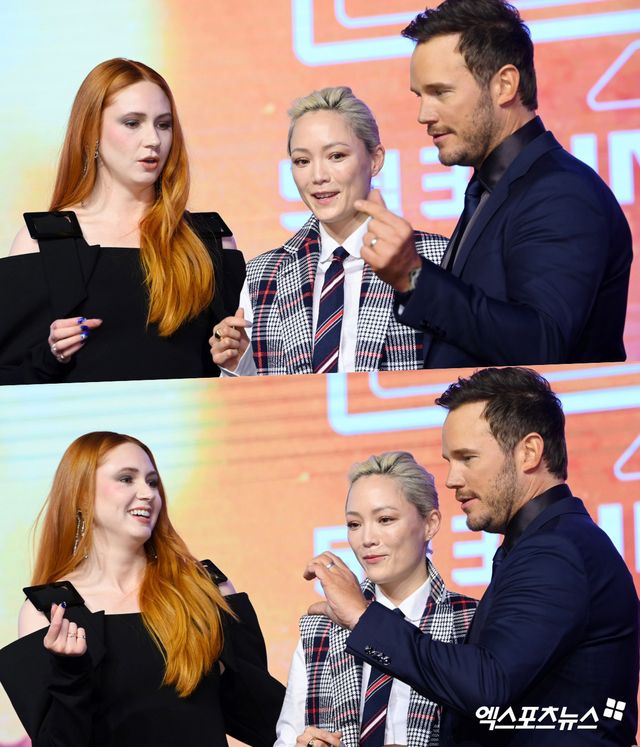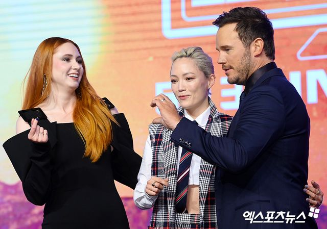 배우 카렌 길런, 폼 클레멘티에프, 크리스 프랫이 기자간담회에 참석해 포토타임을 갖고 있다.