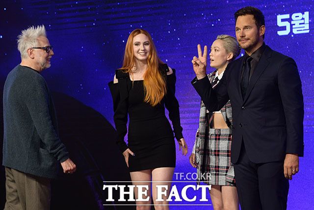 제임스 건 감독과 배우 카렌 길런, 폼 클레멘티에프, 크리스 프랫(왼쪽부터).