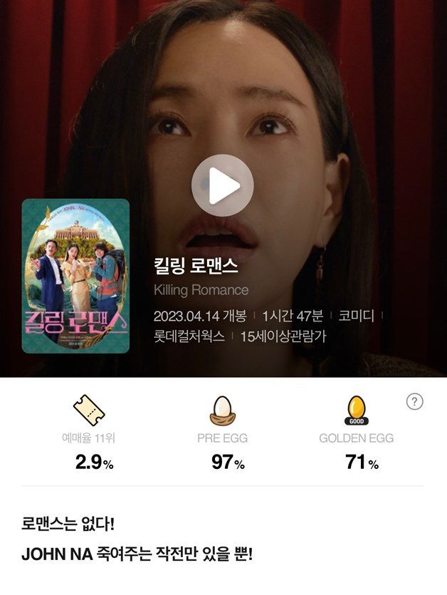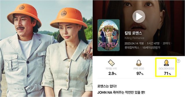 하지만 '킬링 로맨스'는 개봉 6일째에 마침내 71%를 기록, 무려 10%P가 오르는 '평점 역주행'을 기록하고 있다.