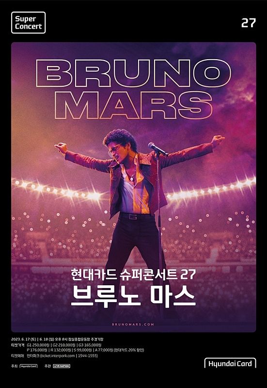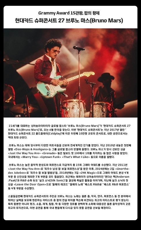 미국 출신의 세계적인 팝스타인 브루노 마스는 현대카드 자사 콘서트 브랜드 '슈퍼콘서트'의 27번째 주인공이 됐다. 2014년 첫 내한 공연 이후 약 9년 만에 한국 팬들과 공연장에서 만난다.