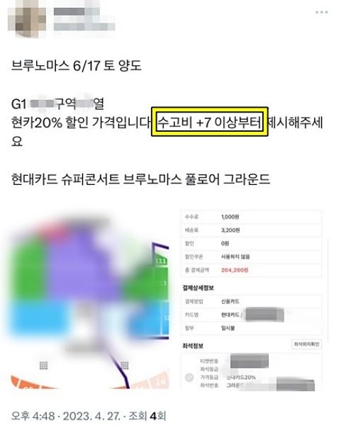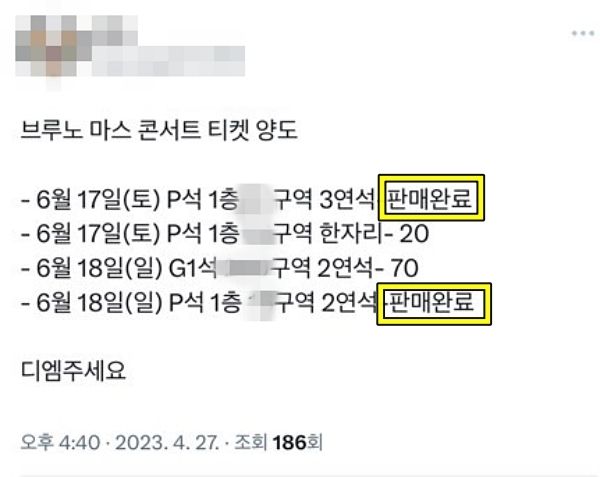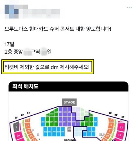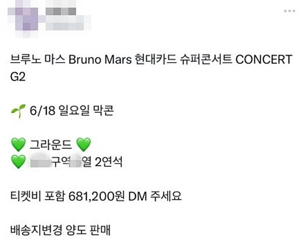 암표 거래에 나선 이들은 "수고비 +7 이상부터 제시해 주세요", "무대 중앙 쪽 2장 연석 일괄 양도합니다. 티켓값 제외하고 수고비만 적어서 디엠(다이렉트 메시지) 주세요. 장당 +10 이상부터"라며 가격을 흥정했다.