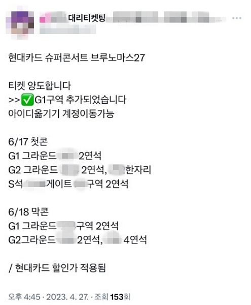 브루노 마스 내한 공연 1차 티케팅(현대카드 회원 대상)이 진행된 27일 오후 트위터에 올라온 암표상 글 / 이하 트위터