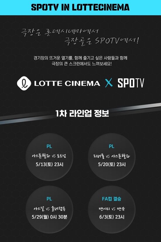 롯데시네마와 SPOTV가 선보이는 첫 중계는 오는 13일 오후 11시에 진행하는 프리미어리그 아스톤빌라 vs 토트넘의 경기로 시작된다.