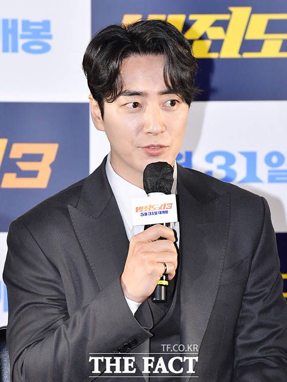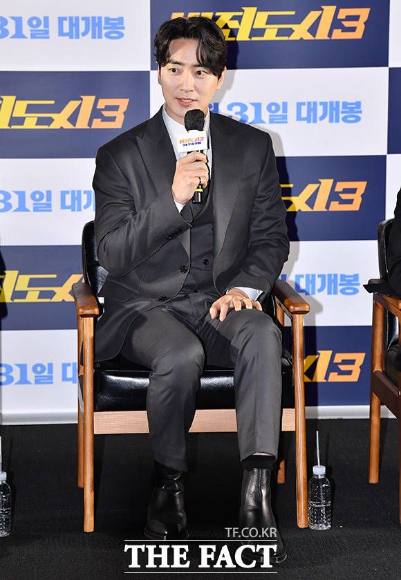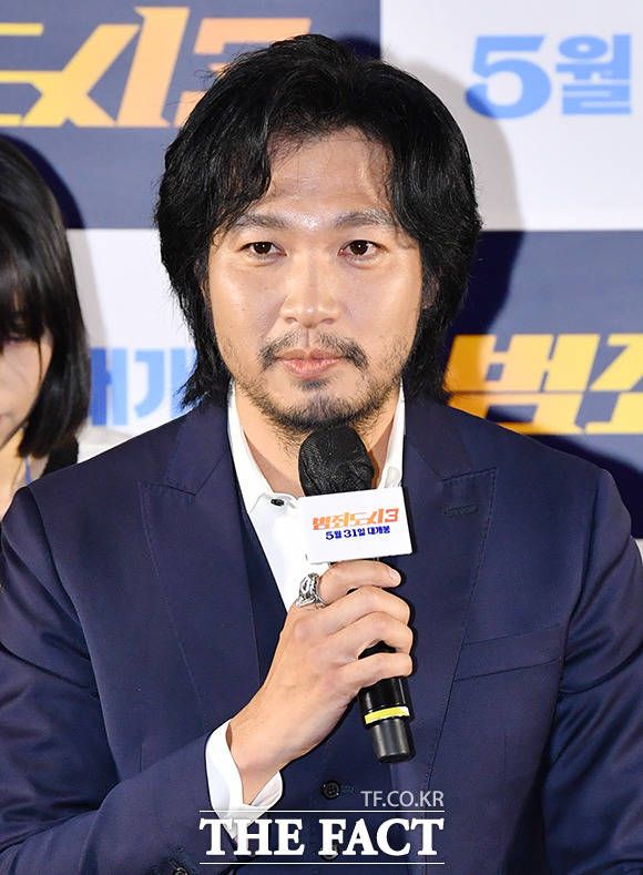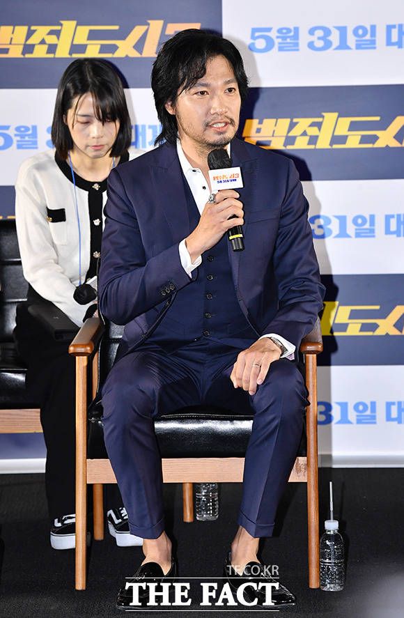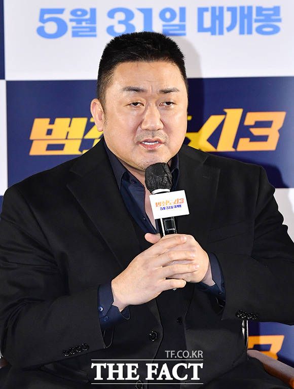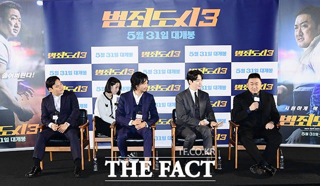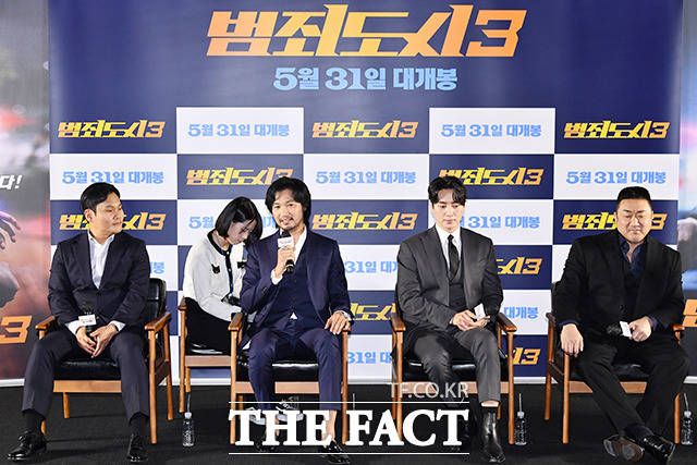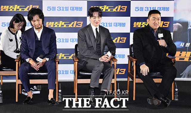[더팩트ㅣ박헌우 기자] 배우 마동석과 이준혁, 아오키 무네타카, 이상용 감독(오른쪽부터)이 9일 오전 서울 강남구 메가박스 코엑스에서 열린 영회 '범죄도시3' 제작보고회에 참석하고 있다.