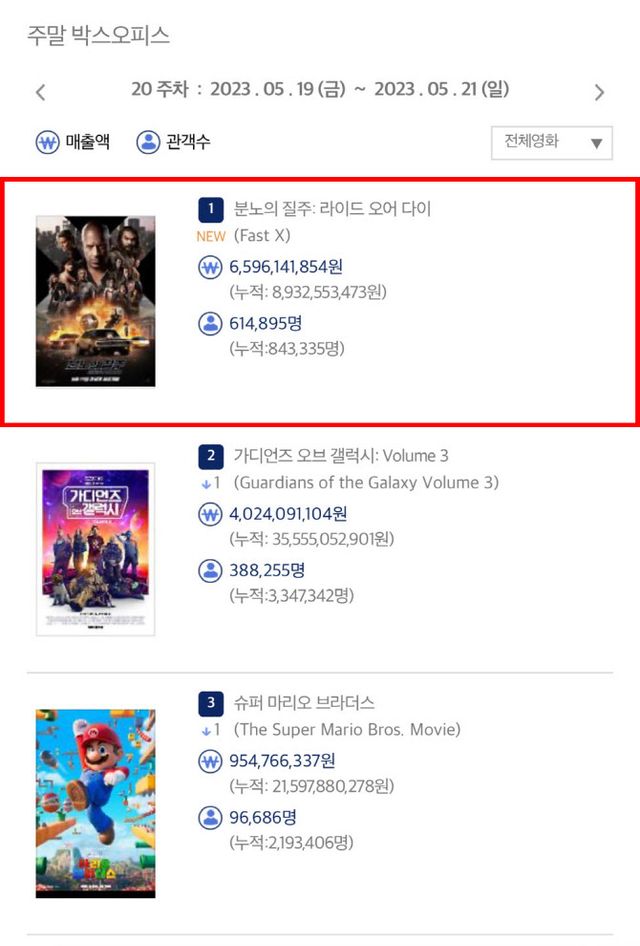 2위를 차지한 ‘가오갤3’는 주말 사흘간 38만 8255명을 동원해 누적 관객 수 334만 7342명을 기록했고, ‘슈퍼 마리오 브라더스’가 3위로 9만 6686명을 끌어모아 누적 관객 수 219만 3406명이 됐다.
