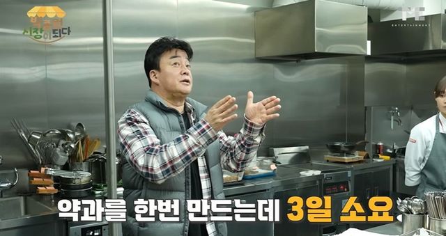 공개된 영상엔 예산시장 내 위치한 떡집을 위해 약과 레시피 개발에 도전한 백종원의 모습이 담겼다.