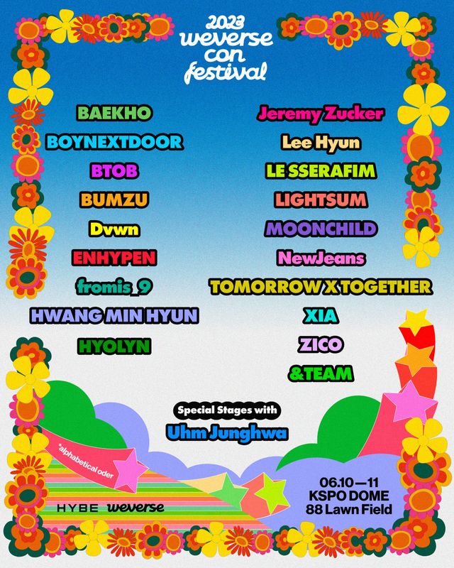 한편, 6월 10일과 11일 양일간 올림픽공원 KSPO DOME과 88잔디마당에서 개최되는 위버스콘 페스티벌은 글로벌 팬덤 라이프 플랫폼 ‘위버스(Weverse)’의 다채로운 팬 경험을 즐길 수 있는 뮤직&팬 라이프 페스티벌이다. 현재의 대중음악 특징과 트렌드를 가장 종합적으로 경험해 볼 수 있는 페스티벌로, 세계적으로 사랑 받는 K-POP 아티스트부터 신인 아티스트는 물론, 다채로운 매력의 그룹과 솔로 아티스트, 미국과 일본 등 해외 아티스트에 이르기까지 폭 넓은 음악 스펙트럼을 가진 라인업을 만나볼 수 있다. 지난 4월 최종 라인업 19개 팀이 발표된 이후 글로벌 팬덤과 대중 사이에서 새로운 뮤직 페스티벌에 대한 기대감이 증가되고 있다.