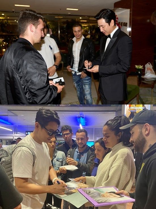 영화계 인사들과 대화를 나누고 있는 이선균, 그리고 글로벌 팬들에게 둘러싸여 사인을 해주는 배우들의 모습을 통해 현지의 열띤 분위기와 함께 K-콘텐츠의 인기를 실감케 한다.