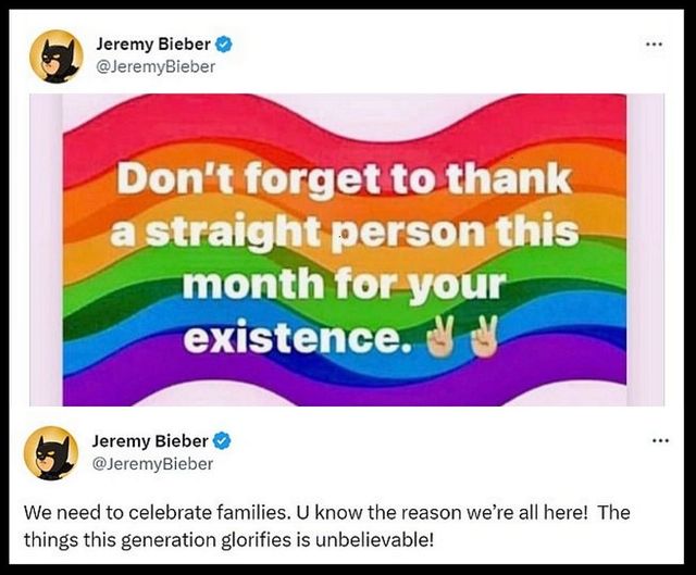 제레미 비버(48)는 자신의 소셜네트워크서비스에 “이성애자에게 감사하는 것을 잊지 말아라”라는 의미심장한 글을 올렸다. 이를 두고 일각에선 6월 성소수자의 달을 의식한 것이라고 해석했다. 뿐만 아니라 제레미 비버는 “이 세대가 미화하고 있는 것을 믿을 수 없다”라는 글을 남기기도 했다.