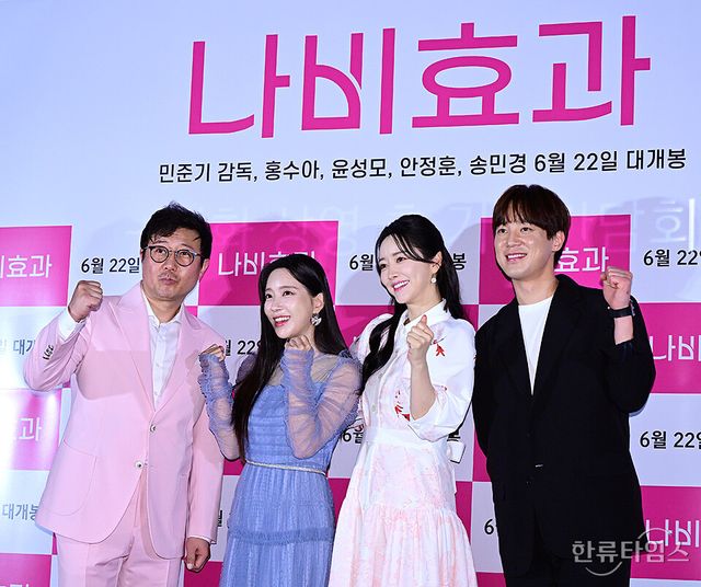 배우 홍수아, 윤성모, 안정훈, 송민경이 9일 오후 서울 용산구 CGV용산아이파크몰에서 열린 영화 '나비효과' 언론시사회에 참석해 포토타임을 갖고 있다.