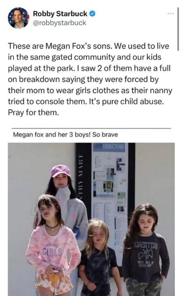 앞서 정치인 로비 스타벅은 메간 폭스와 그의 세 아들 사진을 올리며 “우리는 같은 커뮤니티에 살고 있고 우리의 아이들은 공원에서 놀았다”, “나는 그들의 보모에 의해 메간 폭스가 자신의 아들들에게 여자 옷을 입으라고 강요했다는 사실을 알게 됐다. 이것은 명백한 아동 학대다. 그들을 위해 기도해 달라”라는 글을 남겼다. 함께 공개된 사진 속 메간 폭스의 세 아들은 여자 옷을 입고 있다.