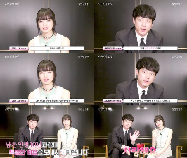 1박 2일의 짧은 내한 일정을 아쉬워하며 돌아간 고마츠 나나와 사카구치 켄타로가 변치 않는 사랑으로 장기 흥행을 이끌고 있는 한국 관객에게 감사 메시지를 전했다. “안녕하세요”라는 능숙한 한국어로 영상을 시작한 두 사람은 “‘남은 인생 10년’은 서로 반대의 상황에 놓였던 두 남녀가 운명적으로 만나 애틋한 사랑을 나누는 로맨스 영화”라고 설명하며 “한국 관객분들도 큰 사랑과 응원 보내주고 계신데요. 덕분에 저희가 이렇게 한국에서 여러분과 직접 만날 수 있어 기쁘고 감사합니다”라고 고마움을 표했다. 이어 “영화 ‘남은 인생 10년’과 함께 특별한 계절을 보내시기 바랍니다. 사랑해요”라고 전했다. 더 많은 관객과 극장에서 만나기를 희망했던 두 사람은 특히 “사랑해요”라는 멘트를 한국어로 전하는 특급 서비스로 팬들의 마음을 또 한 번 사로잡았다.