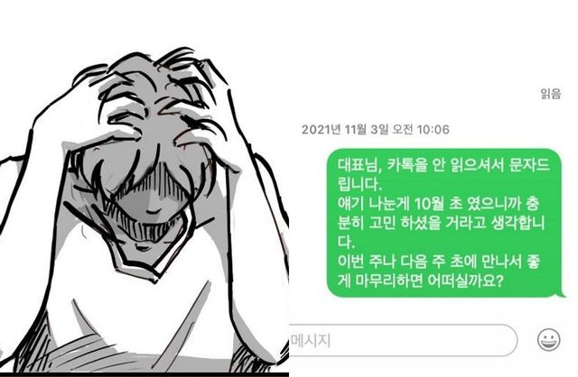 그는 “그렇게 일을 하다 보니 제가 죽을 것 같았어요. 그래서 2021년 10월 8일, 2021년 10월 14일에 제작사 대표에게 계약서를 수정하자고 요청했어요. 하지만 답이 없었습니다”라고 전했다. 참다가 감정이 복받쳤다는 A 씨는 다른 스태프들이 모여있는 대화창에 ‘이제 마무리하겠다’라는 메시지를 남겼다.