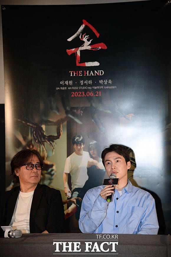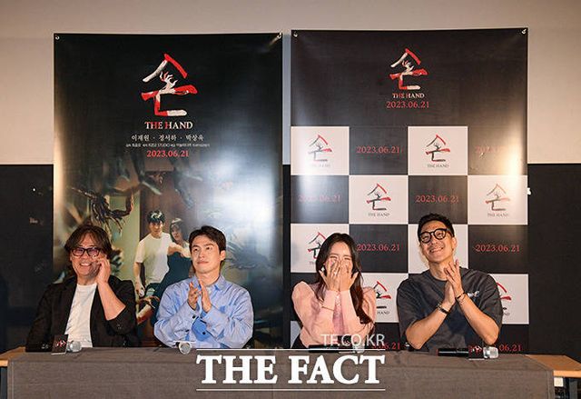 [더팩트ㅣ장윤석 인턴기자] 감독 최윤호와 배우 이재원, 정서하, 박상욱이 16일 오후 서울 광진구 롯데시네마 건대입구점에서 열린 영화 '손' 언론 배급 시사회에 참석해 취재진 질문에 미소를 짓고 있다.