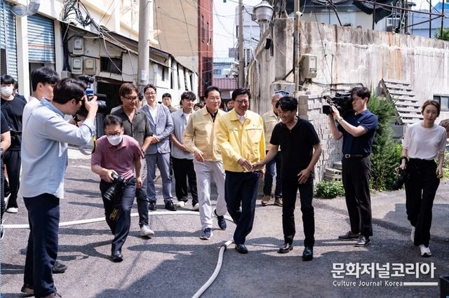 박형준 부산시장이 부산 로케이션 영화 <산복도로>의 촬영현장을 방문하여 감독과 스텝, 배우들을 만나 격려하였다.