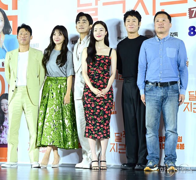 배우 유해진, 김희선, 차인표, 진선규, 한선화, 이한 감독이 14일 오전 서울 광진구 롯데시네마 건대입구점에서 열린 영화 '달짝지근해: 7510' 제작보고회에 참석해 포토타임을 갖고 있다.