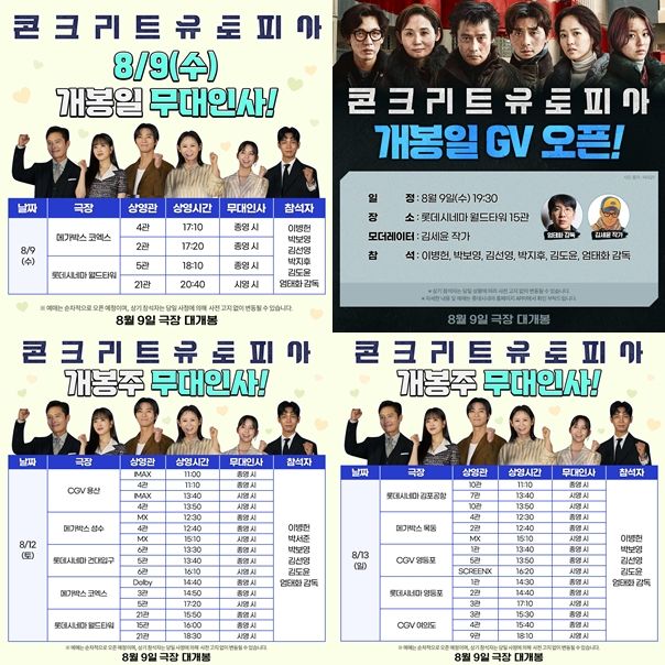 강렬한 캐릭터의 케미스트리와 배우들의 열연으로 기대를 모으는 영화 '콘크리트 유토피아'가 8월 9일 개봉일을 시작으로, 12일, 13일 개봉 주말 서울 지역 무대인사를 확정했다.