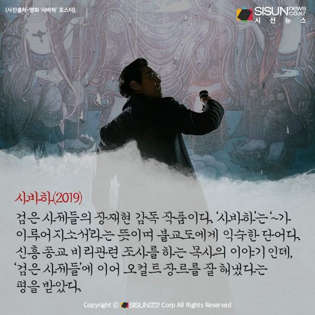검은 사제들의 장재현 감독 작품이다. ‘사바하’는 ‘~가 이루어지소서’라는 뜻이며 불교도에게 익숙한 단어다. 신흥 종교 비리관련 조사를 하는 목사의 이야기인데, ‘검은 사제들’에 이어 오컬트 장르를 잘 해냈다는 평을 받았다.