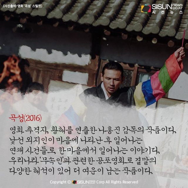 영화 추격자, 황해를 연출한 나홍진 감독의 작품이다. 낯선 외지인이 마을에 나타난 후 일어나는 연쇄 사건들로, 한 마을에서 일어나는 이야기다. 우리나라 ‘무속인’과 관련한 공포영화로 평점 7.3, 누적관객 680만 명으로 흥행한 공포영화며 결말의 다양한 해석이 있어 더 여운이 남는 작품.