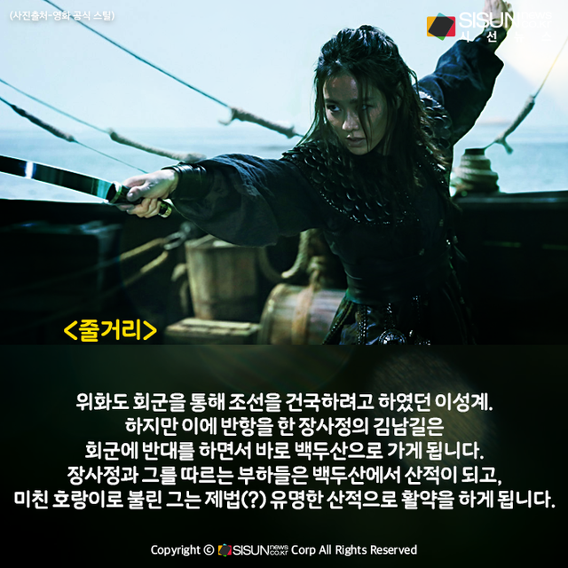 위화도 회군을 통해 조선을 건국하려고 하였던 이성계. 하지만 이에 반항을 한 장사정의 김남길은 회군에 반대를 하면서 바로 백두산으로 가게 됩니다. 장사정과 그를 따르는 부하들은 백두산에서 산적이 되고, 미친 호랑이로 불린 그는 제법(?) 유명한 산적으로 활약을 하게 됩니다.