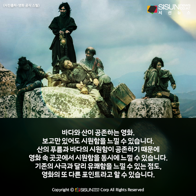 바다와 산이 공존하는 영화. 보고만 있어도 시원함을 느낄 수 있습니다. 산의 푸름과 바다의 시원함이 공존하기 때문에 영화 속 곳곳에서 시원함을 동시에 느낄 수 있습니다. 기존의 사극과 달리 유쾌함을 느낄 수 있는 점도, 영화의 또 다른 포인트라고 할 수 있습니다.